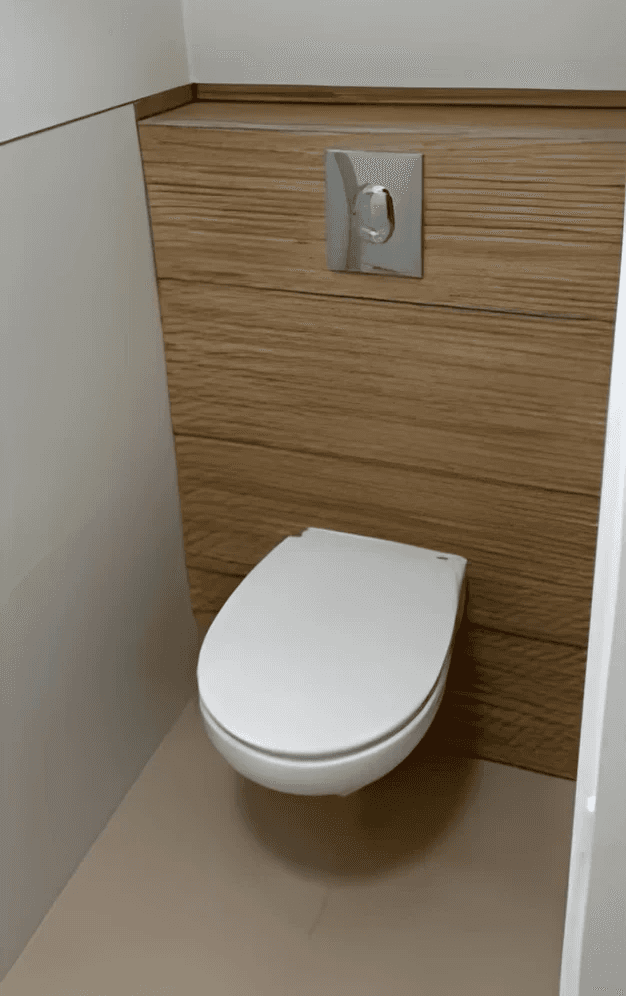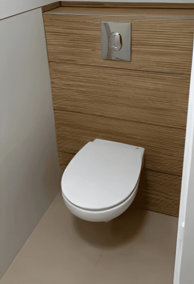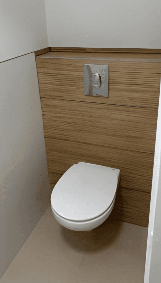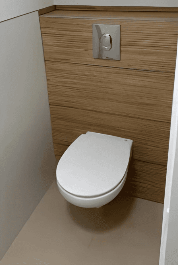 Remplacement de l’ancien WC par un modèle suspendu avec habillage mural moderne.