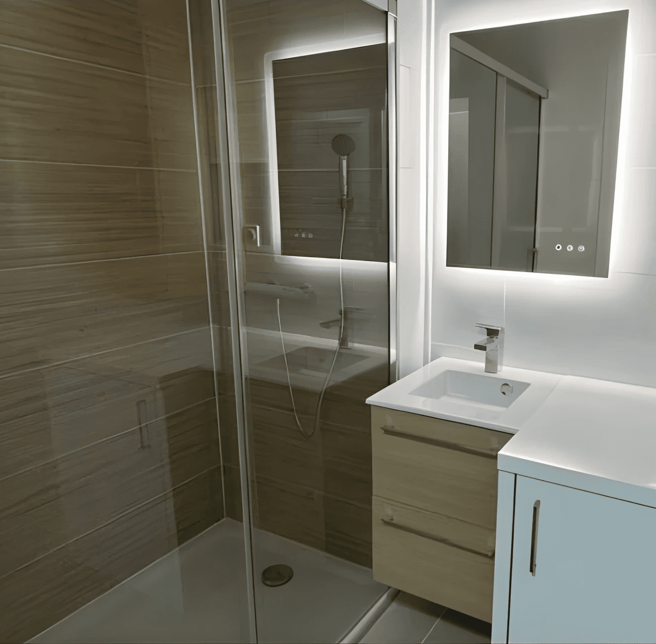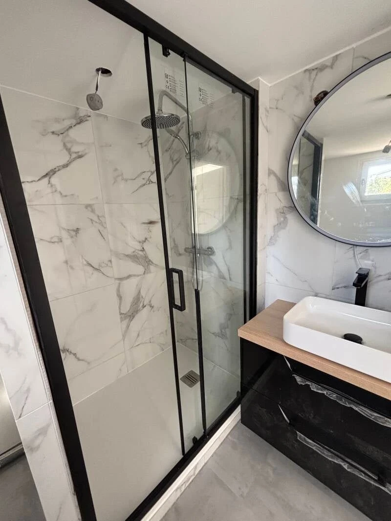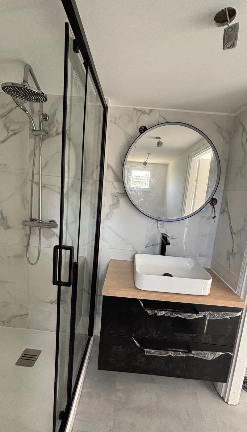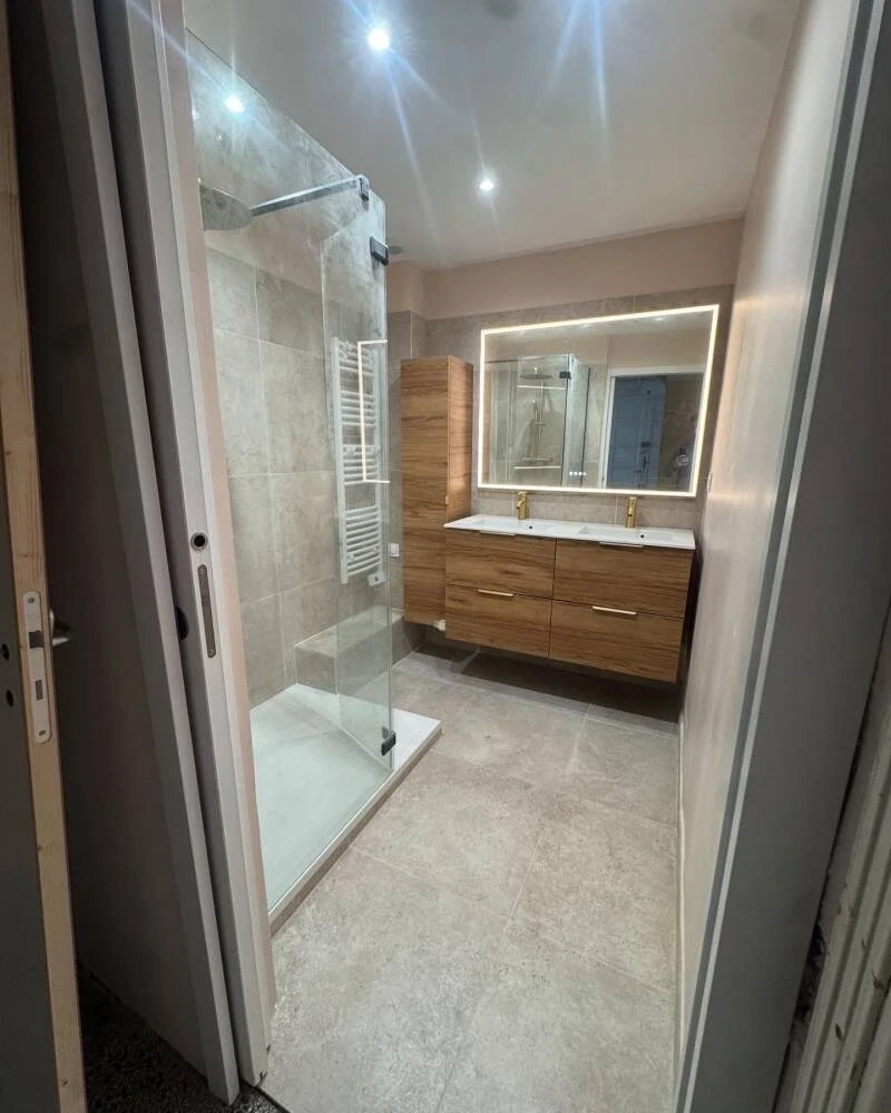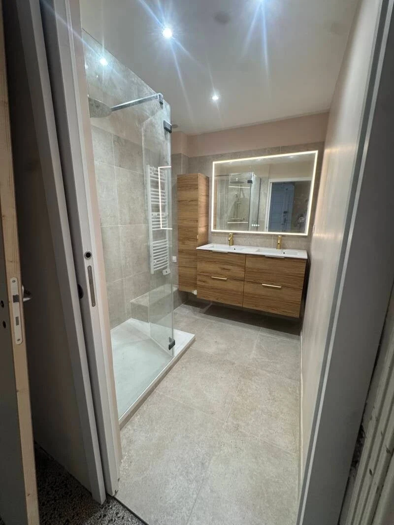 Modernisation complète : douche, meuble vasque, carrelage et éclairage.